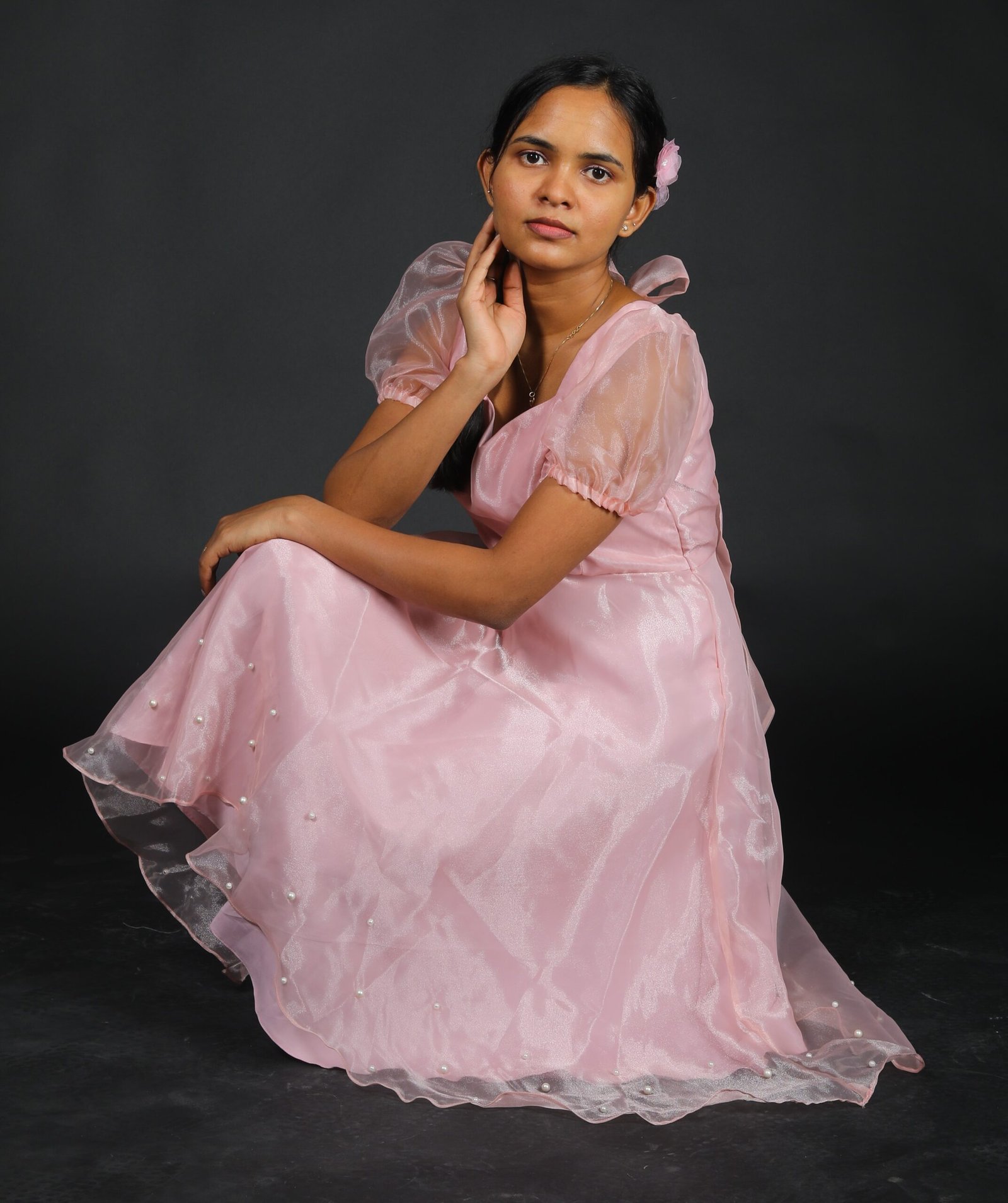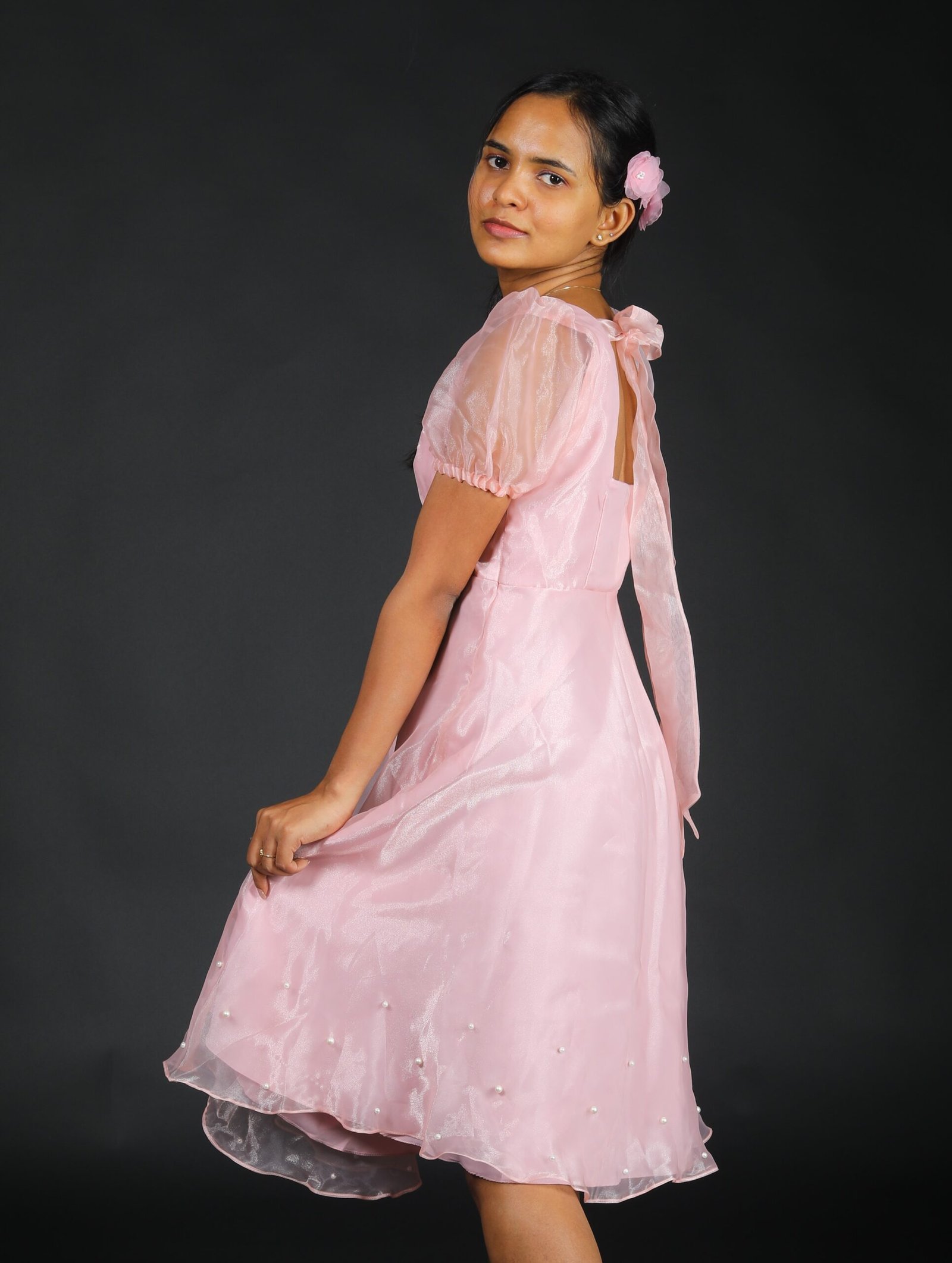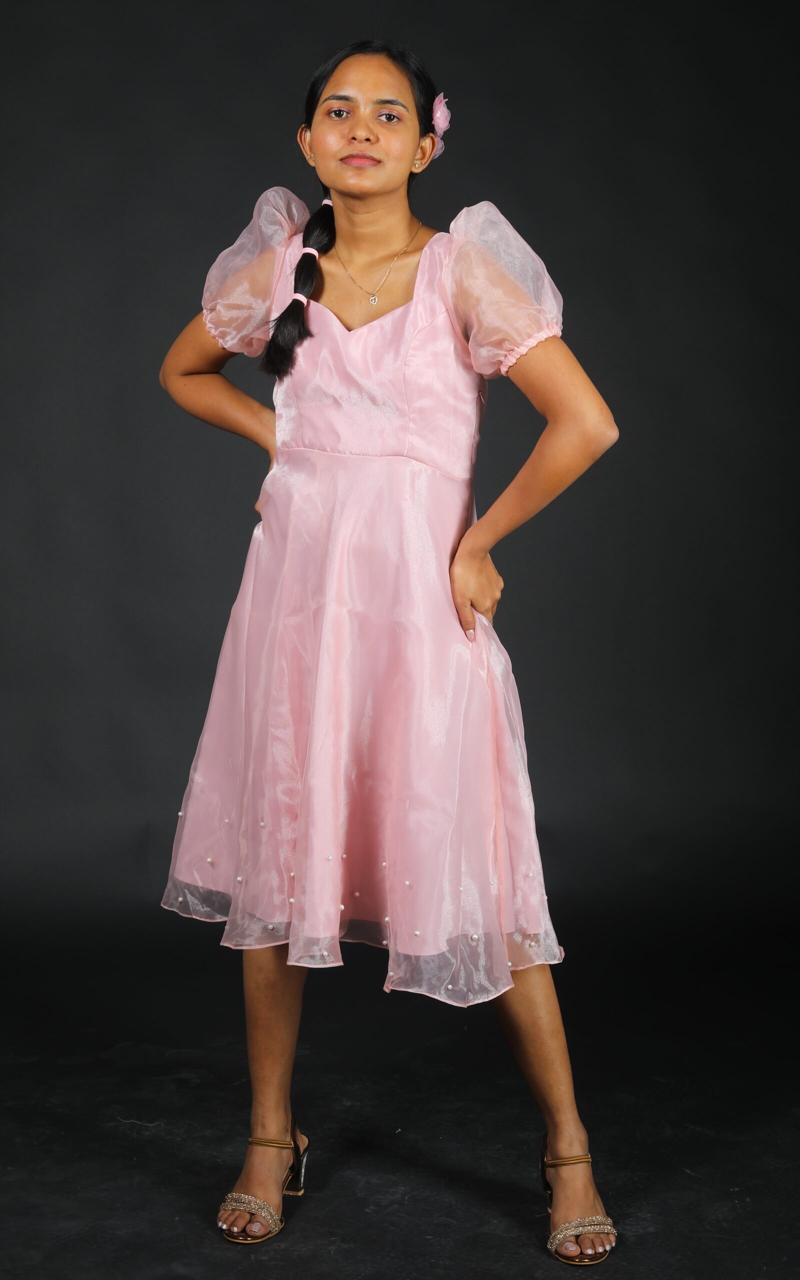 This shimmer organza semi umbrella frock features a sweetheart neckline and puff sleeves with bow detailing at back and bead detailing at the hemline.