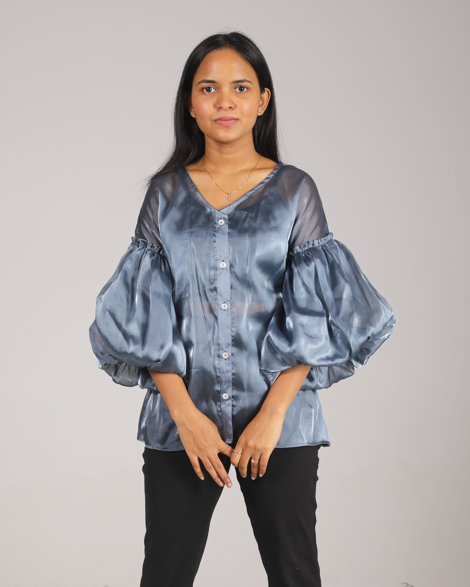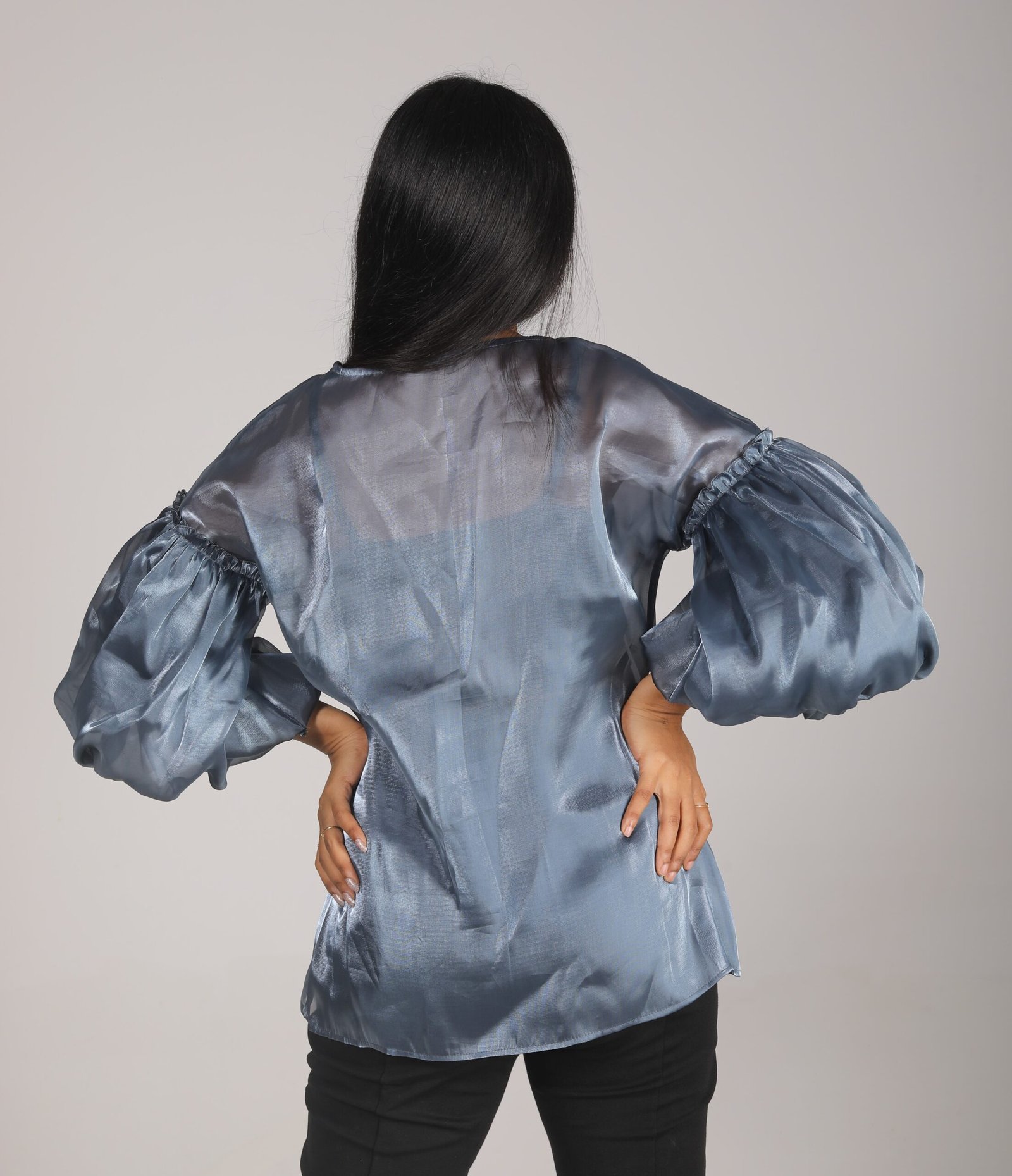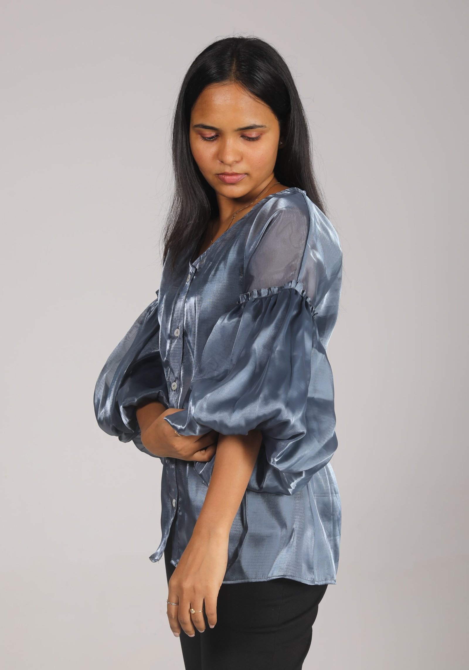 This shimmer organza shirt features a v neckline with drop shoulder and inverted puff sleeves detail and curved hem.